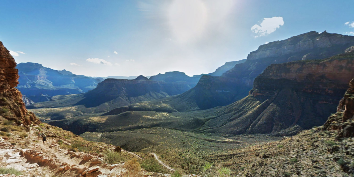 It took a team of 10 Googlers and 5 Trekkers about 3 full days to adequately capture the main trails of the Grand Canyon's south rim. Two Trekker teams hiked down the Bright Angel Trail, camped overnight at Phantom Ranch, and then hiked out the next day along the South Kaibab Trail. Another three Trekker teams remained at the top of the Grand Canyon collecting imagery around the rim as well as the South Rim Trail. Our team also ventured out to collect imagery of Meteor Crater, just outside Grand Canyon National Park.