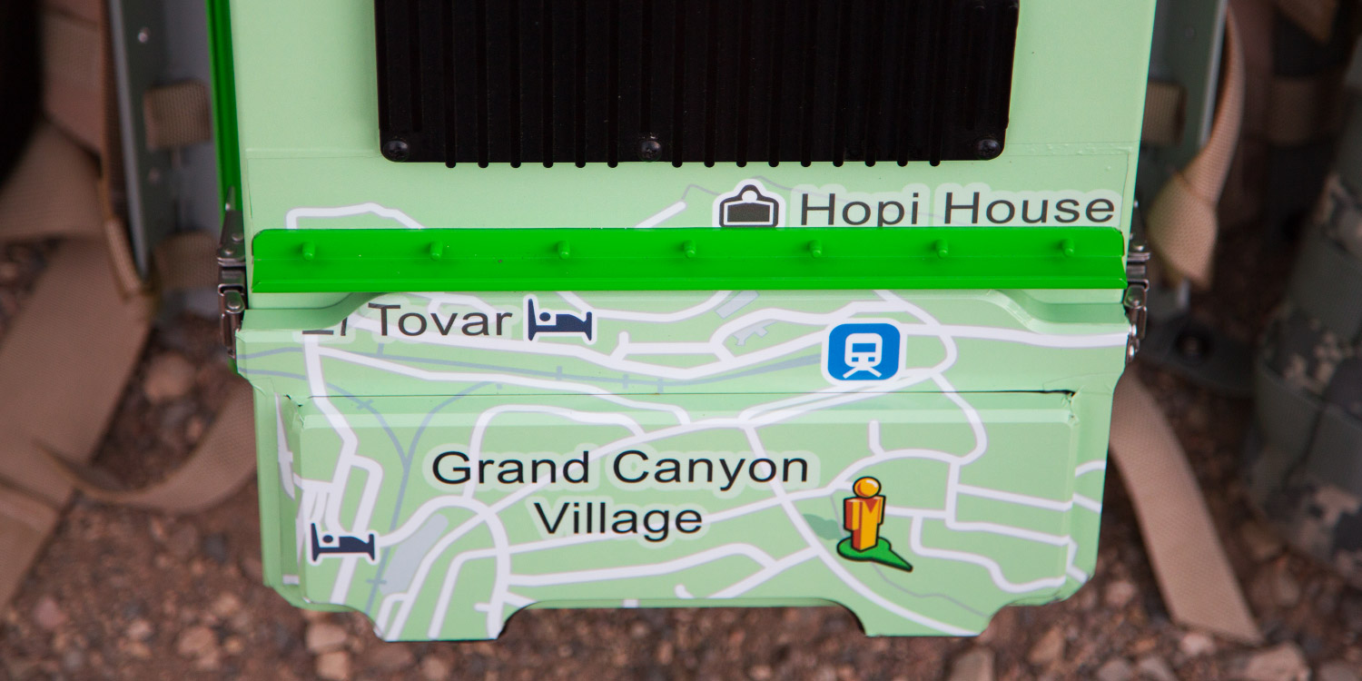 The rugged terrain, ridges and steep trails of the Grand Canyon are the perfect setting to showcase the functionality of the Trekker. The narrow trails would be inaccessible to our traditional Street View cars, trikes, and trolleys, but is perfect for the wearable Trekker backpack. The compact size of the Trekker makes it unobtrusive and easy to maneuver, while automatically gathering images as it goes. The Trekker is operated by an Android device and consists of 15 lenses at the top of the mast, each angled in a different direction that will enable us to stitch together a 360-degree panoramic view.